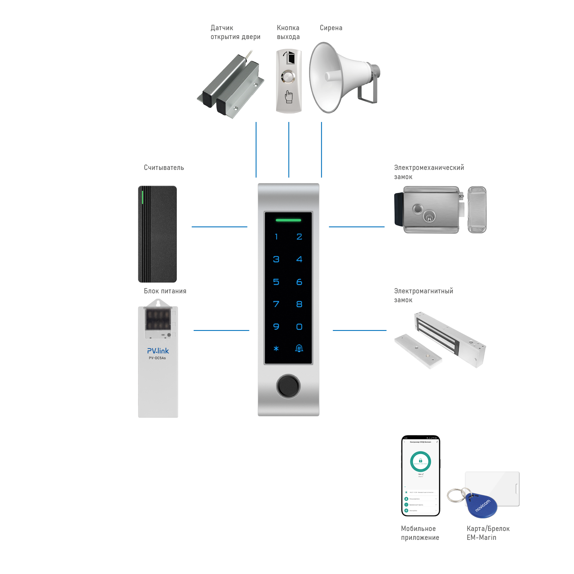 - Встроенные считыватели Em-Marin и отпечатков